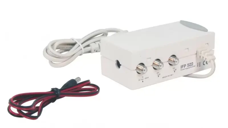 F-connector on all inputs. Simple and easy installation. The 2 outputs are equipped with auto-terminated F connector meaning that there is no need to terminate an un-used output. Including a power supply / inserter to power a UFO antenna when used in a camping-car and powered from the 12V DC delivered from the camping-car.