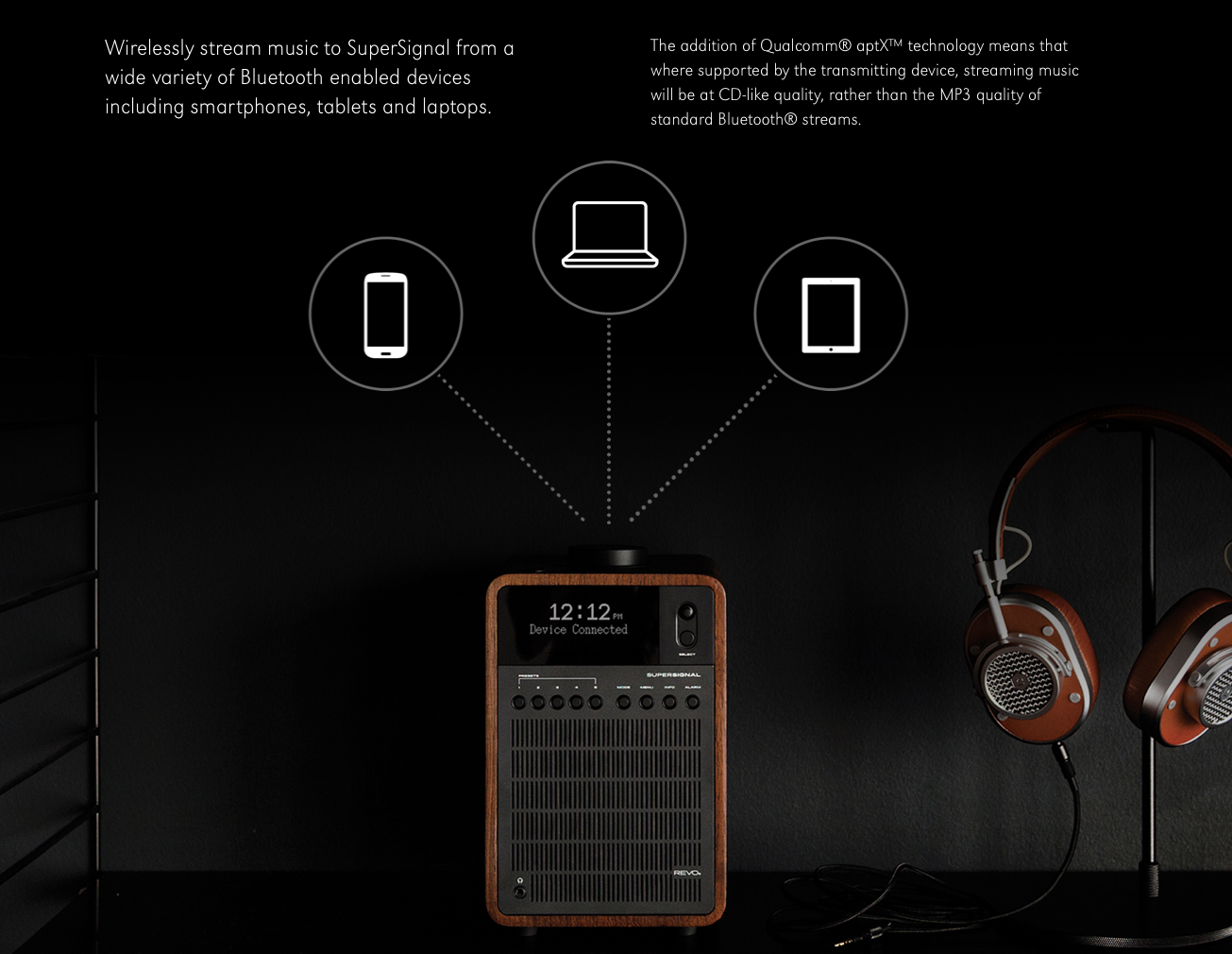 SuperSignal is equipped to receive DAB and DAB+ broadcasts, as well as traditional FM with RDS. Bluetooth support is also included, meaning users can wirelessly stream music from their iPhone, Samsung, Windows Phone, Blackberry or otherBluetooth enabled device, including laptops and tablets – with no physical docking necessary. The addition of CSR’s aptX technology means that where supported by the transmitting device, streaming music will be at CD quality rather than the lower bit rate MP3 quality of standard Bluetooth.