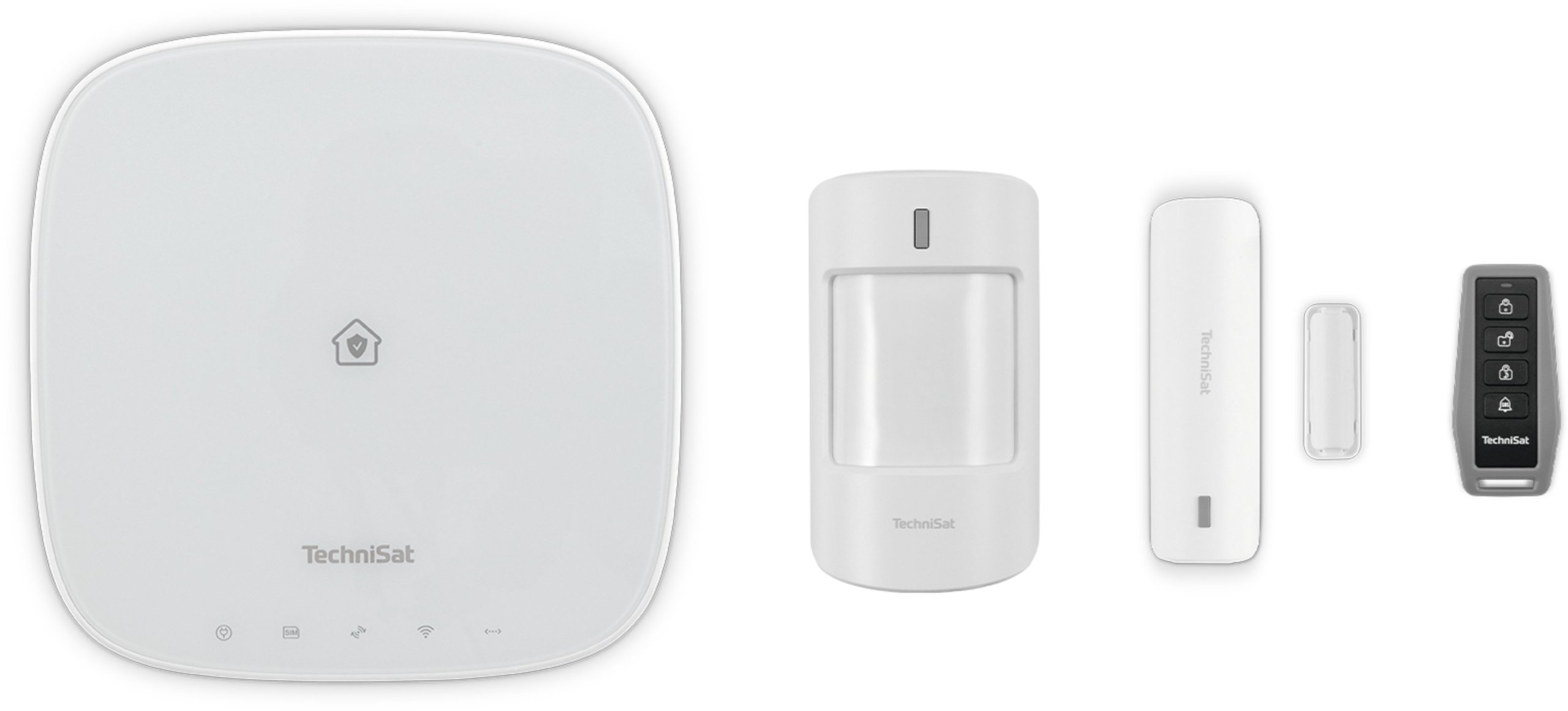 The TECHNISMART starter package includes a central unit, a remote control, a motion sensor and a window and door sensor that registers the closing status of doors and windows. In addition to the devices included in the starter package, our offer also includes other components that work with the TECHNISMART system.