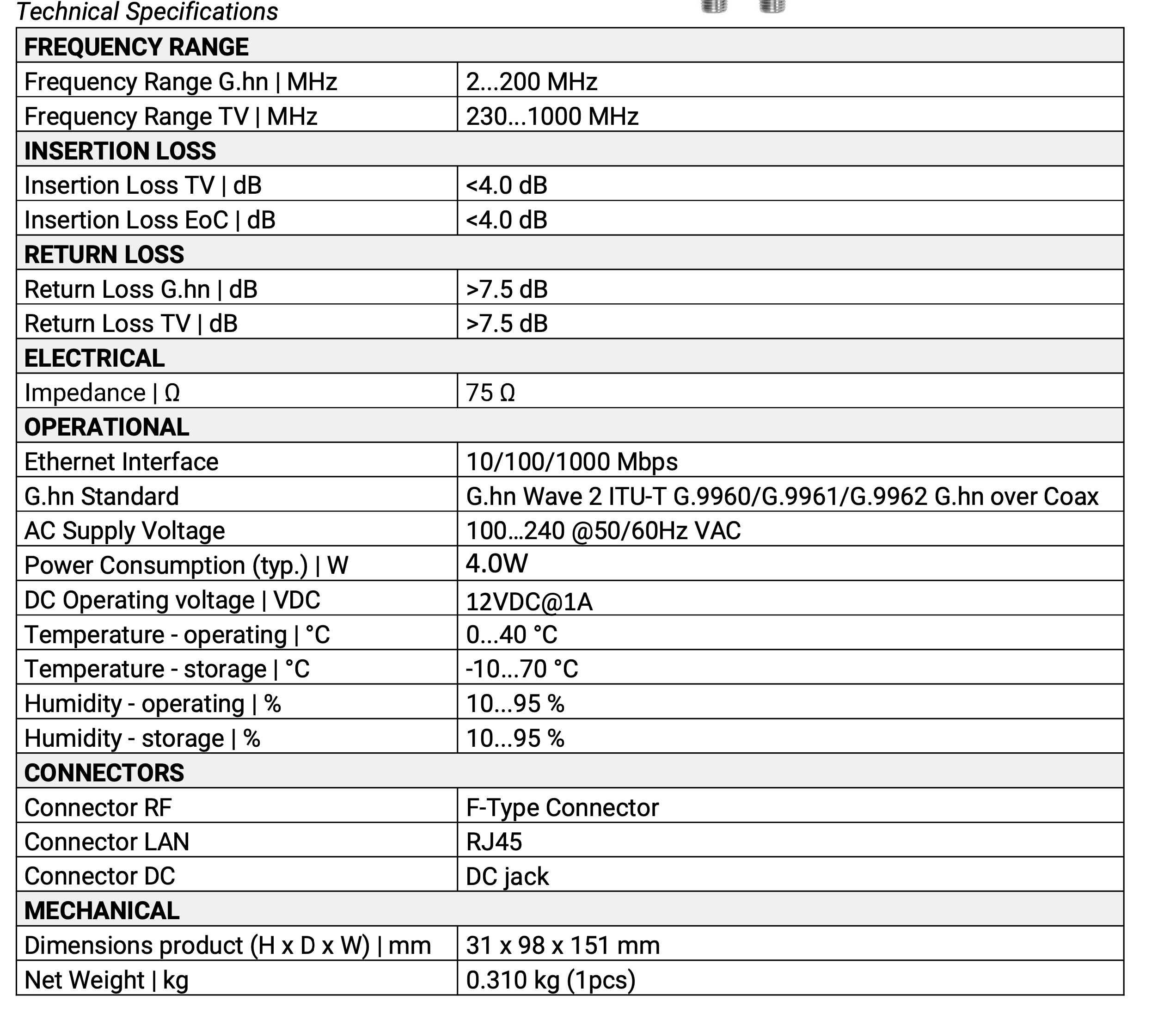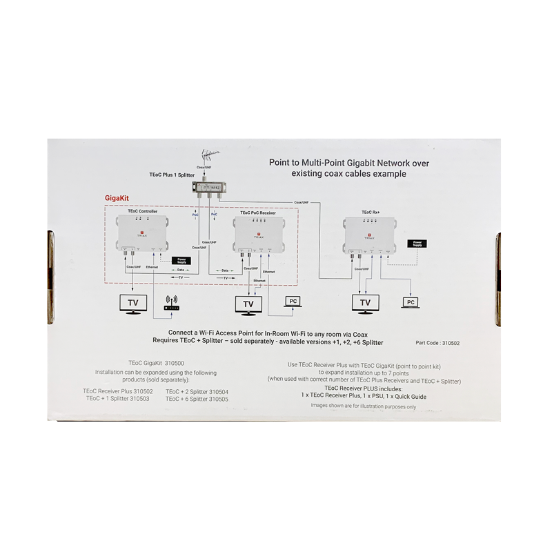Use TEoC Receiver Plus with TEoC GigaKit (Point to Point Kit) to expand your installation up to 7 points (when used with correct number of TEoC RX+ and TEoC + Splitter) to create a Point to Multi-Point Gigabit Network over existing coax cables.